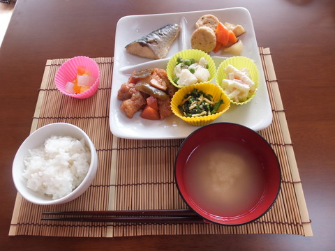 - サバの塩焼き(甘塩)、がんも・ニンジン・ジャガイモなどの炊き合わせ、鳥肉酢豚(こんにゃく・ニンジン)、じゃがいもサラダ風、マカロニサラダ、おひたし、味噌汁、ご飯、デザート
